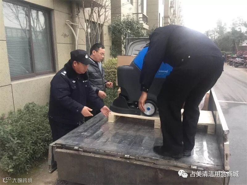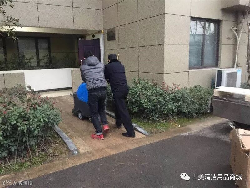 容恩R50B洗地机顺利送达金华鸿基彼岸,物业服务中心的同事一起把容恩R50B洗地机抬下车。