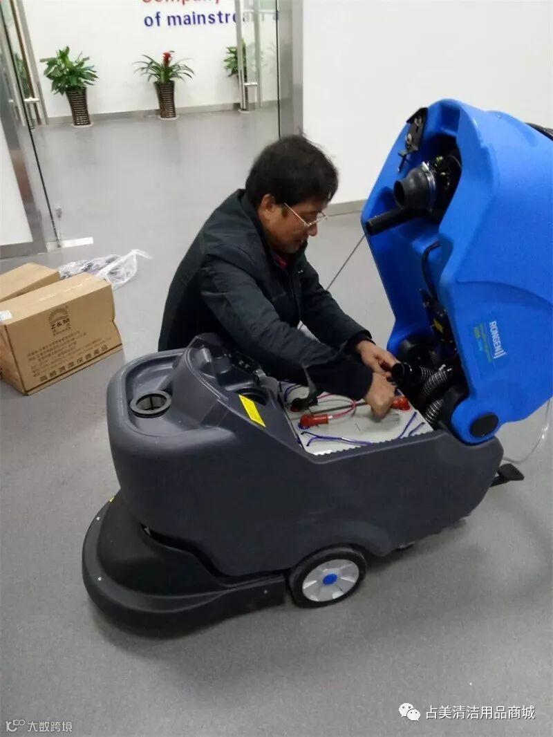 容恩R50B洗地机顺利送到目的地,我们占美公司的维修师傅正在调试容恩R50B洗地机。