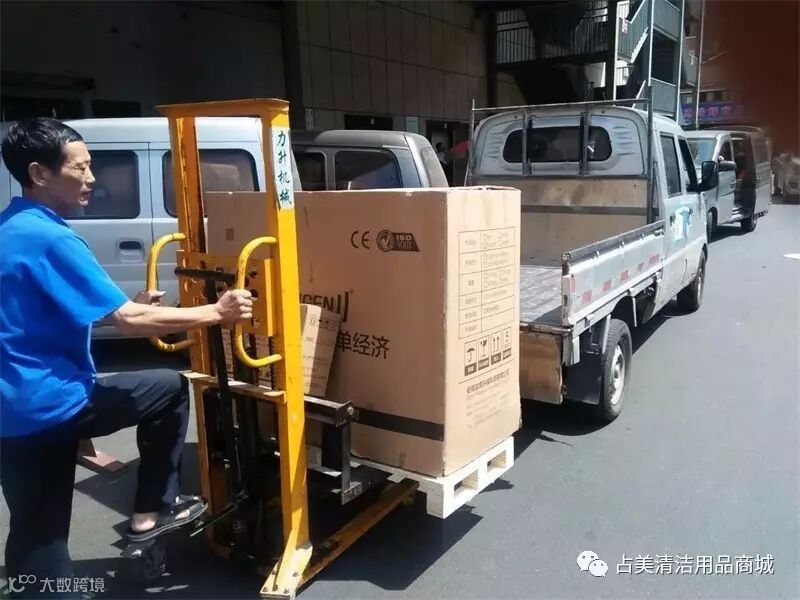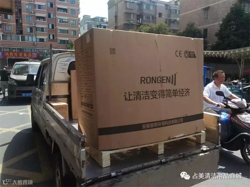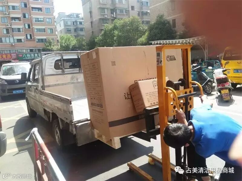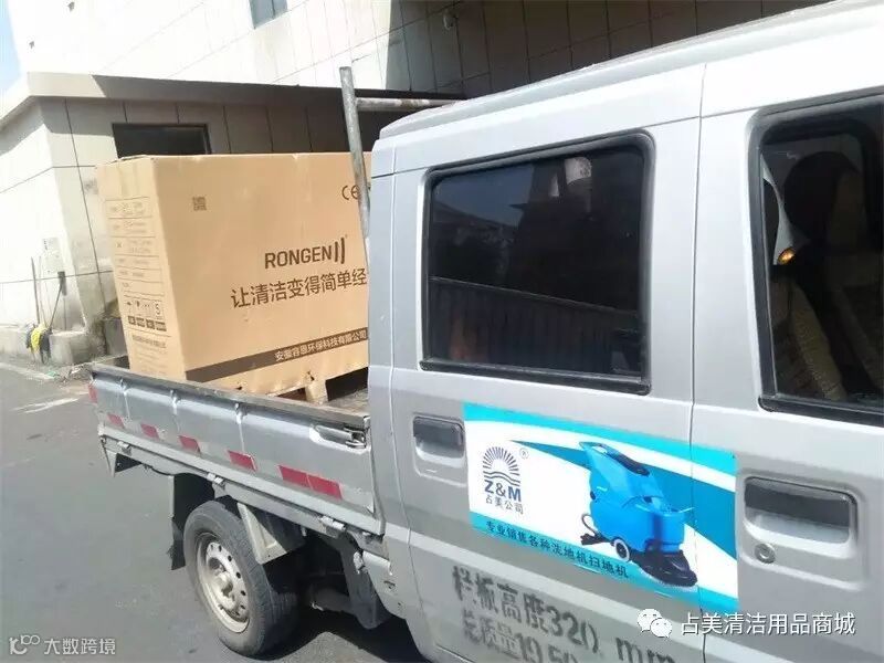 我们占美公司的同事正在把容恩R50B洗地机抬上车。