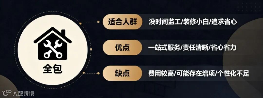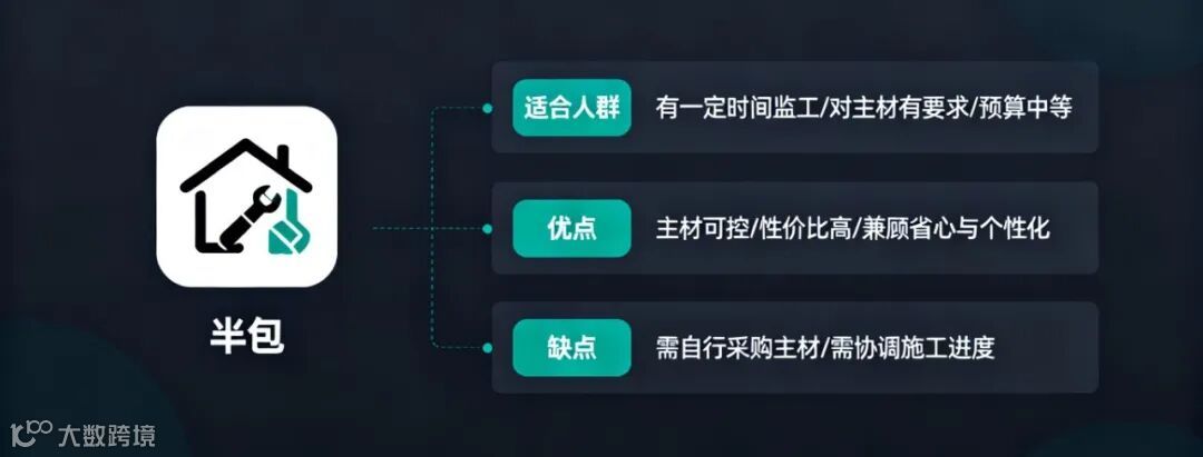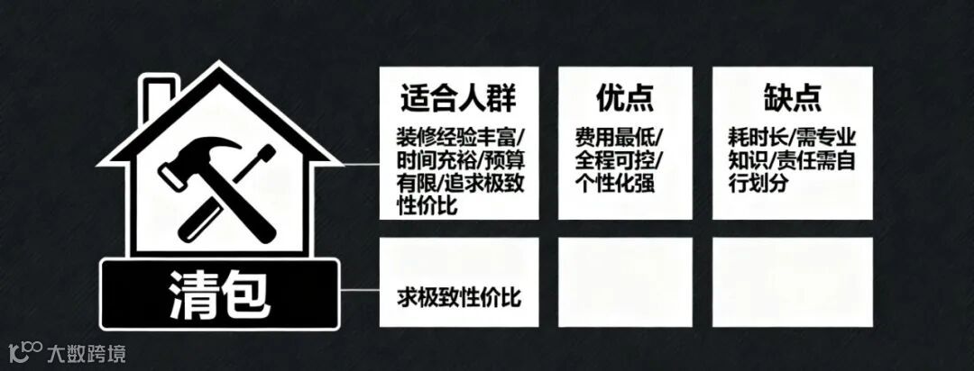 清包:只找施工队,材料全自己买。适合时间充足、对建材很了解的人,缺点是耗时耗力,一旦材料买错会耽误工期。