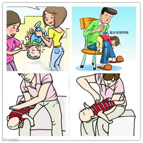 潘医生说,还有个办法:马上把孩子抱起来,一只手捏住孩子颧骨两侧,手臂贴着孩子的前胸,另一只手托住孩子后颈部,让其脸朝下,趴在救护人膝盖上。在孩子背上拍1到5次,看孩子是否将异物吐出。