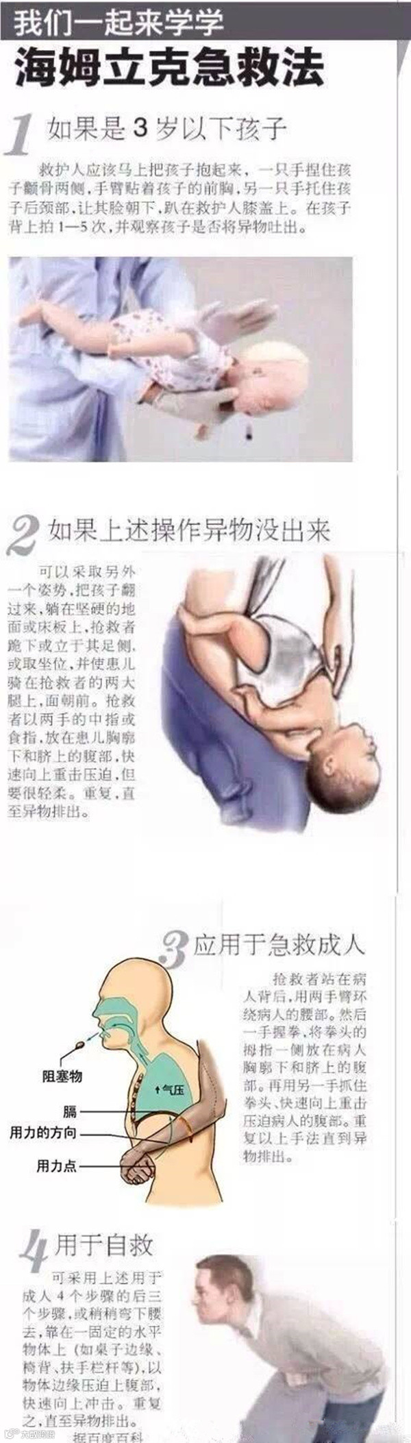 潘医生说,前不久,一个孩子被面条噎住,妈妈一抠孩子喉咙,孩子一恶心就吐出来了。等孩子送到医院时,原先发青的脸色已经恢复正常了。