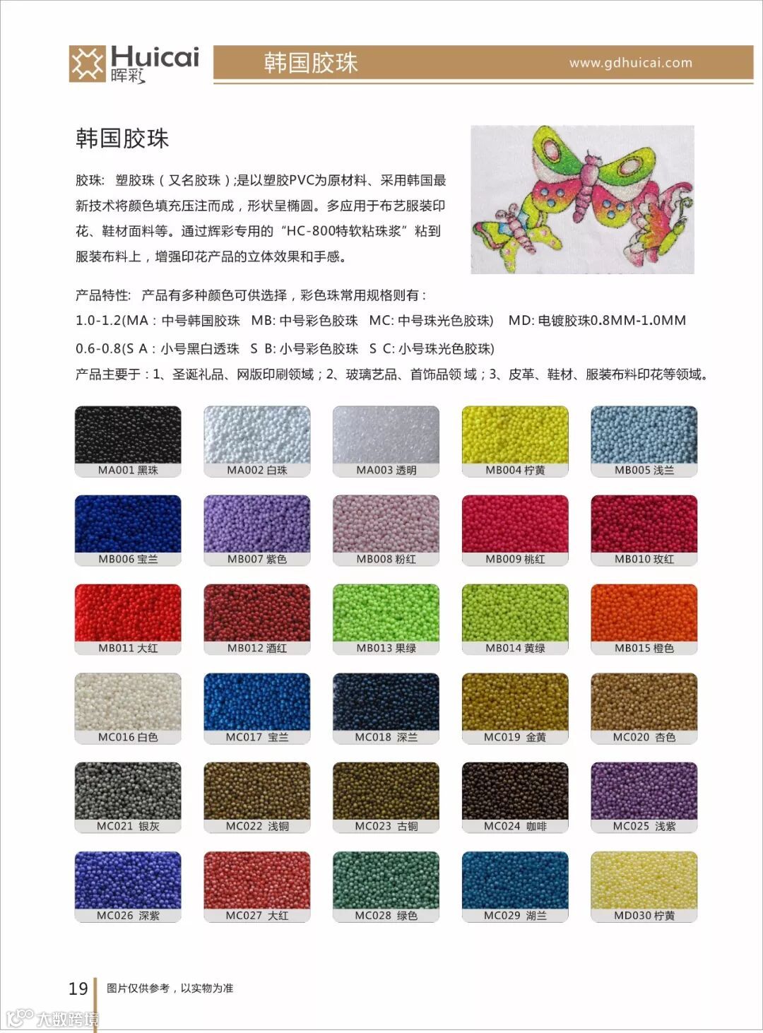 印花胶珠我们可以选择辉彩韩国胶珠,辉彩韩国胶珠, 规格为中号胶珠,大小为1.0~1.2mm可耐高温120~160。通过印花胶浆专用粘珠胶浆粘合到产品上,增强产品的立体效果和手感。
