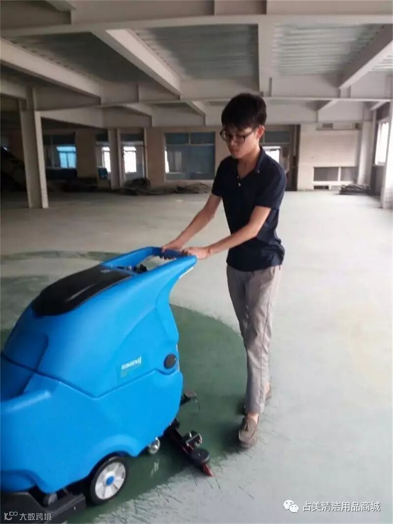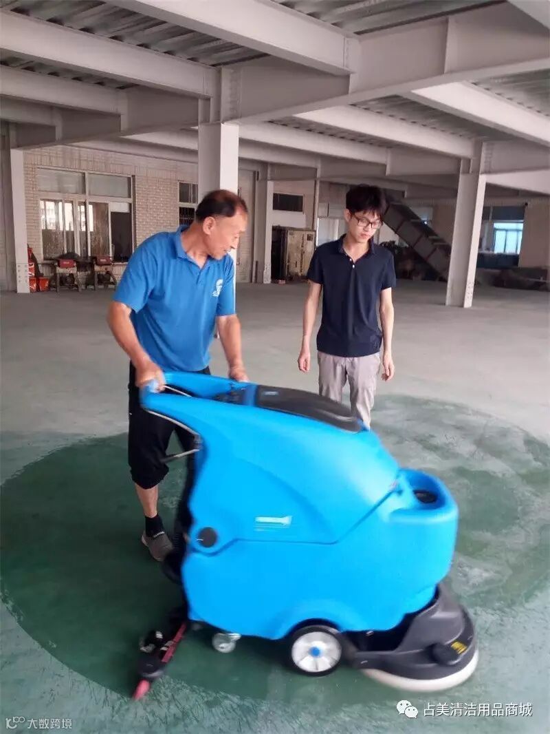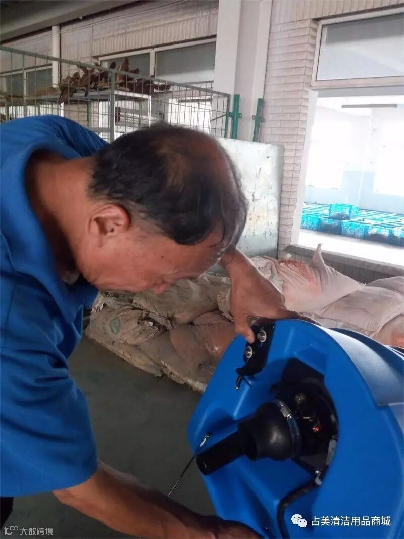 我们占美公司的售后师傅在调试机器,并手把手教客户如何正确使用容恩R50B洗地机。