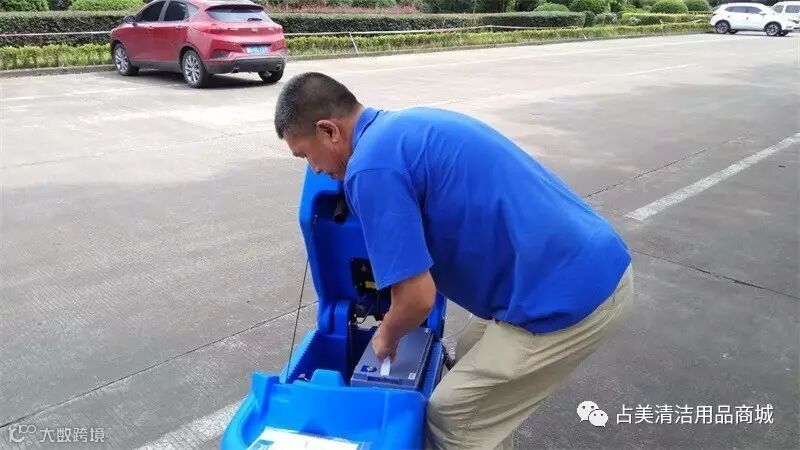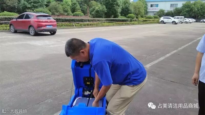义乌占美公司的售后师傅正在调试容恩R50B洗地机中,帮客户检查机器是否有无故障。