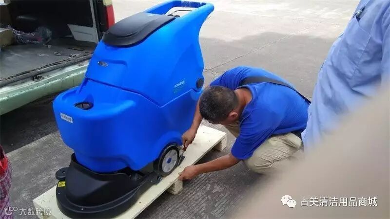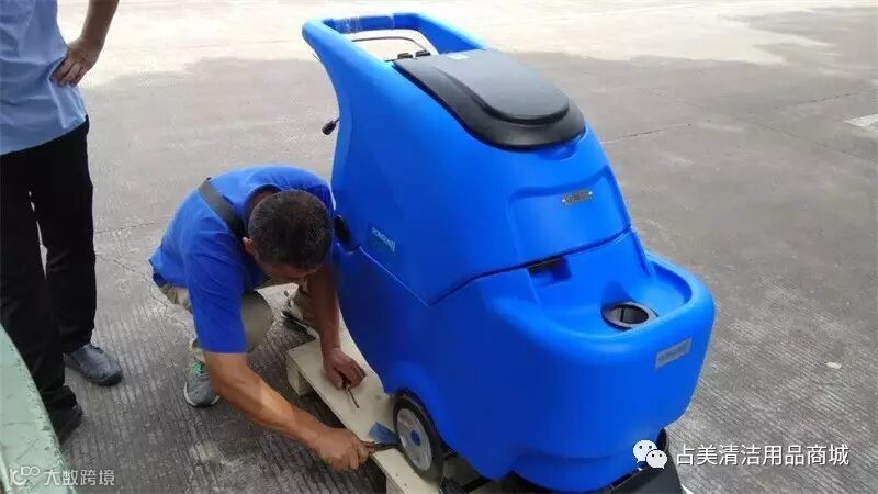 义乌占美公司的售后师傅正在拆容恩R50B洗地机,帮它除去固定包装。