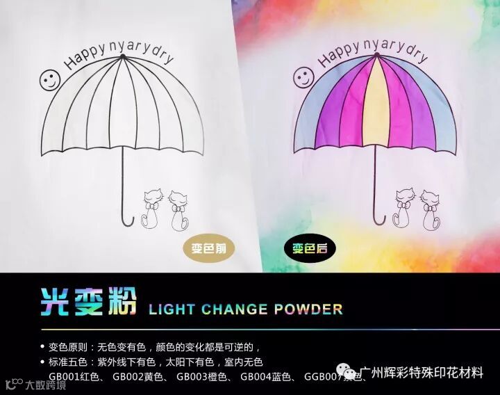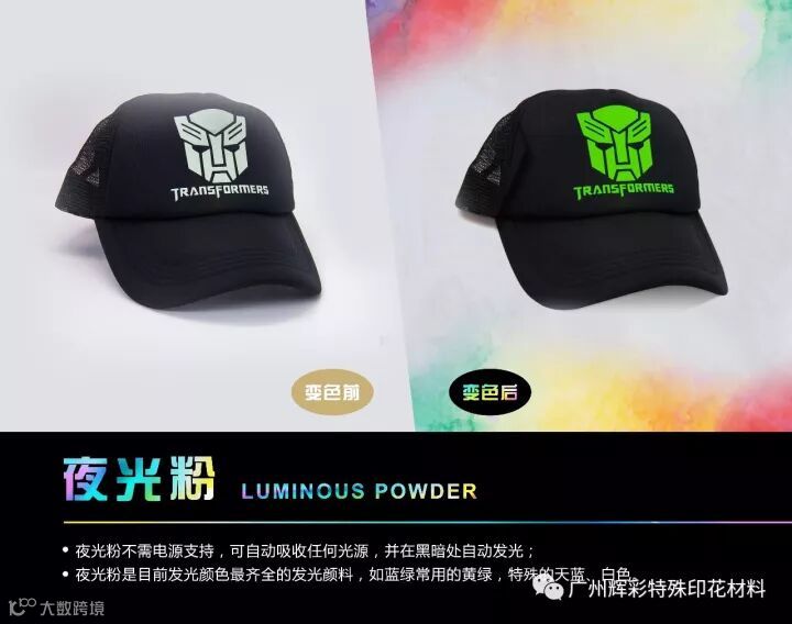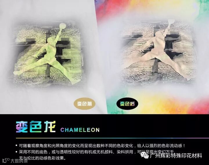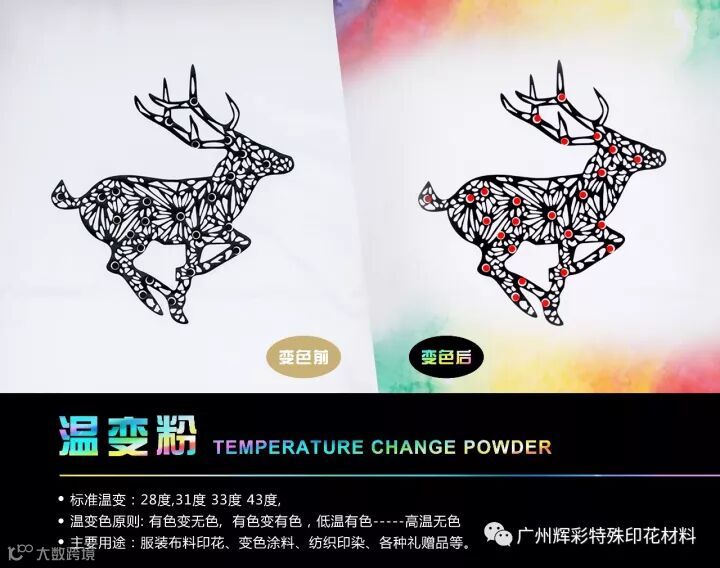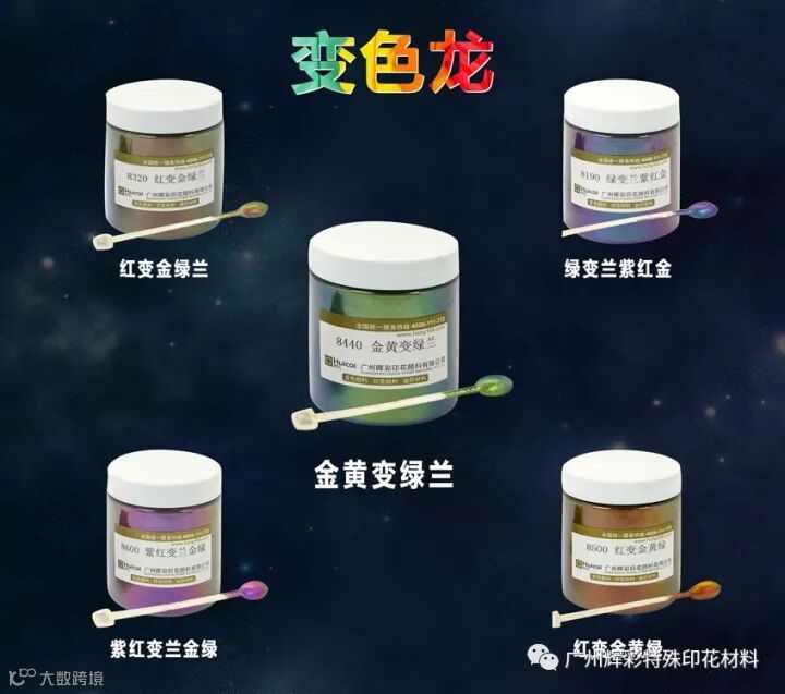 广州辉彩印花颜料有限公司成立于2002年,主要以研发、生产、销售、服务为一体的专注特殊印花材料以及工艺材料供应商,凭借先进的技术、精致的工艺,融合时尚潮流色彩,为客户量身订制个性化、多款式的特殊印花材料,全面满足客户需求,赢得了良好的社会信誉。多年来公司本着“以信誉为本,以质量取胜”的理念,不断推陈出新,辉彩产品已经成为国内最大最出色的光变粉、变色龙、温变粉、夜光粉、铜金粉、印花材料供应商之一。