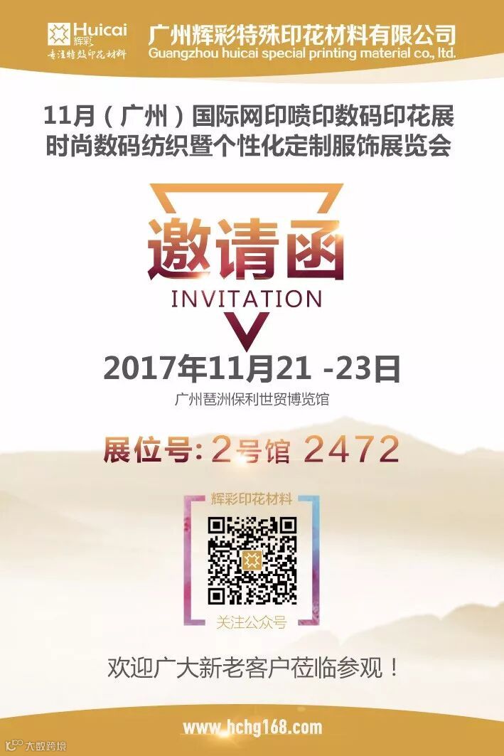 广州辉彩印花颜料有限公司将精彩亮相展会,带来数码印花及丝网印花的全新解决方案!展位号:2号馆2472,欢迎新老客户莅临参观。