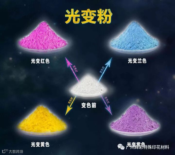 光变粉又称感光变色粉,是经紫外线或阳光照射,吸收紫外线或阳光后,而产生颜色的变化,当失去紫外线或阳光照射时,即回复到原来的颜色。感光变色粉在室内为无色,到室外感应到紫外线后显示颜色。