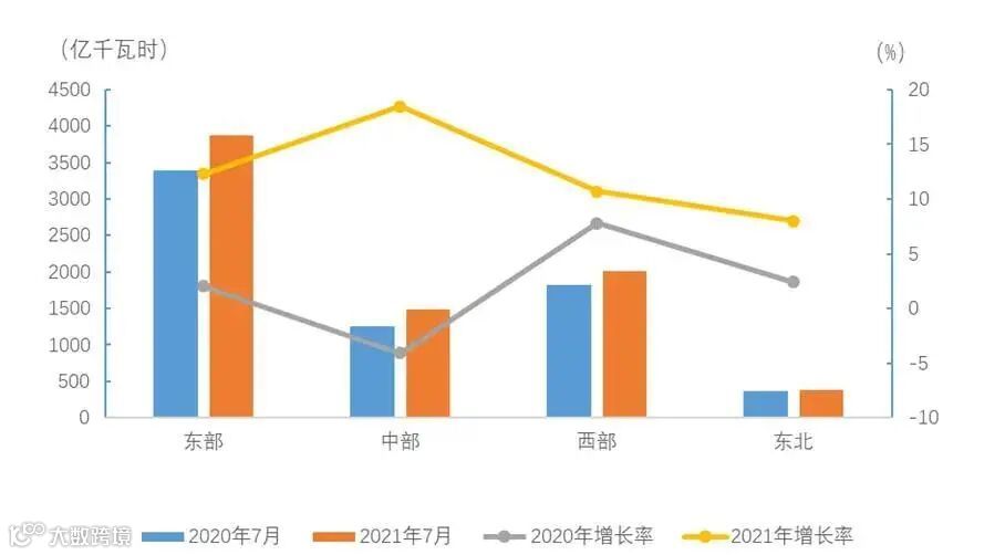 7月份,东、中、西部和东北地区全社会用电量增速分别为12.3%、18.5%、10.7%和8.0%。