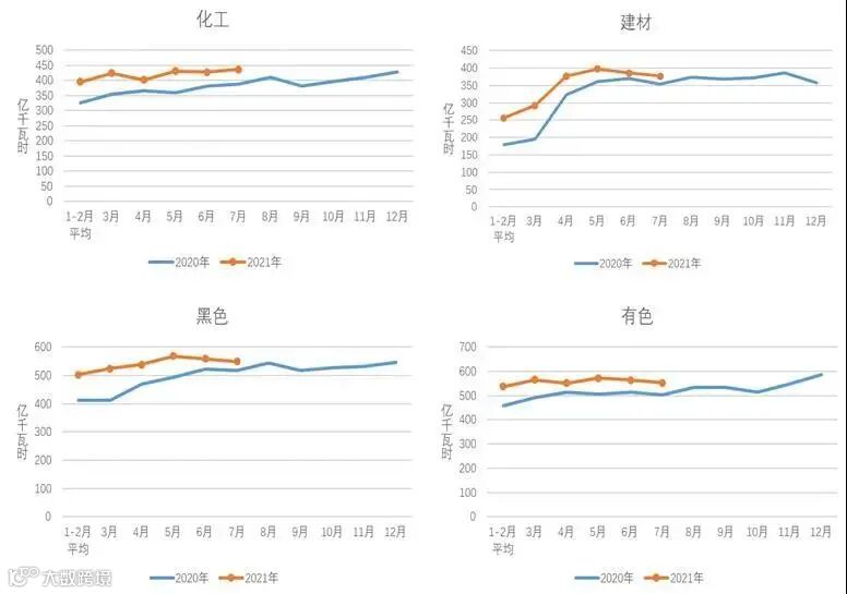 1-7月,化工行业用电量2911亿千瓦时,同比增长11.4%,增速比上年同期提高14.2个百分点;建材行业用电量2343亿千瓦时,同比增长17.1%,增速比上年同期提高19.5个百分点;黑色金属冶炼行业用电量3749亿千瓦时,同比增长14.5%,增速比上年同期提高14.2个百分点;有色金属冶炼行业用电量3880亿千瓦时,同比增长9.0%,增速比上年同期提高6.9个百分点。
