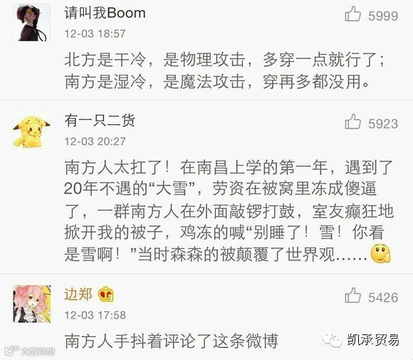 4.南方人太扛了!在南昌上学的第一年,遇到了20年不遇的“大雪”,劳资在被窝里冻成傻逼了,一群南方人在外面敲锣打鼓,室友癫狂地掀开我的被子,鸡冻的喊“别睡了!雪!你看是雪啊!”当时森森的被颠覆了世界观…