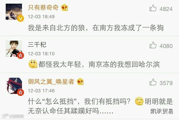 1.我要提醒东北的战友们。冬天没事儿别去南方!我求你们别去!冷死了!别以为你是个东北人就抗冻!离开暖气你啥都不是!!我在安徽,零上5℃都冻出了眼泪!!!室内外是一样的!一样的!!南方人都是神啊卧槽!!怎么抵挡那种可怕的温度的!!我在东北零下30℃一条棉裤hold住,到了南方两条都没用……