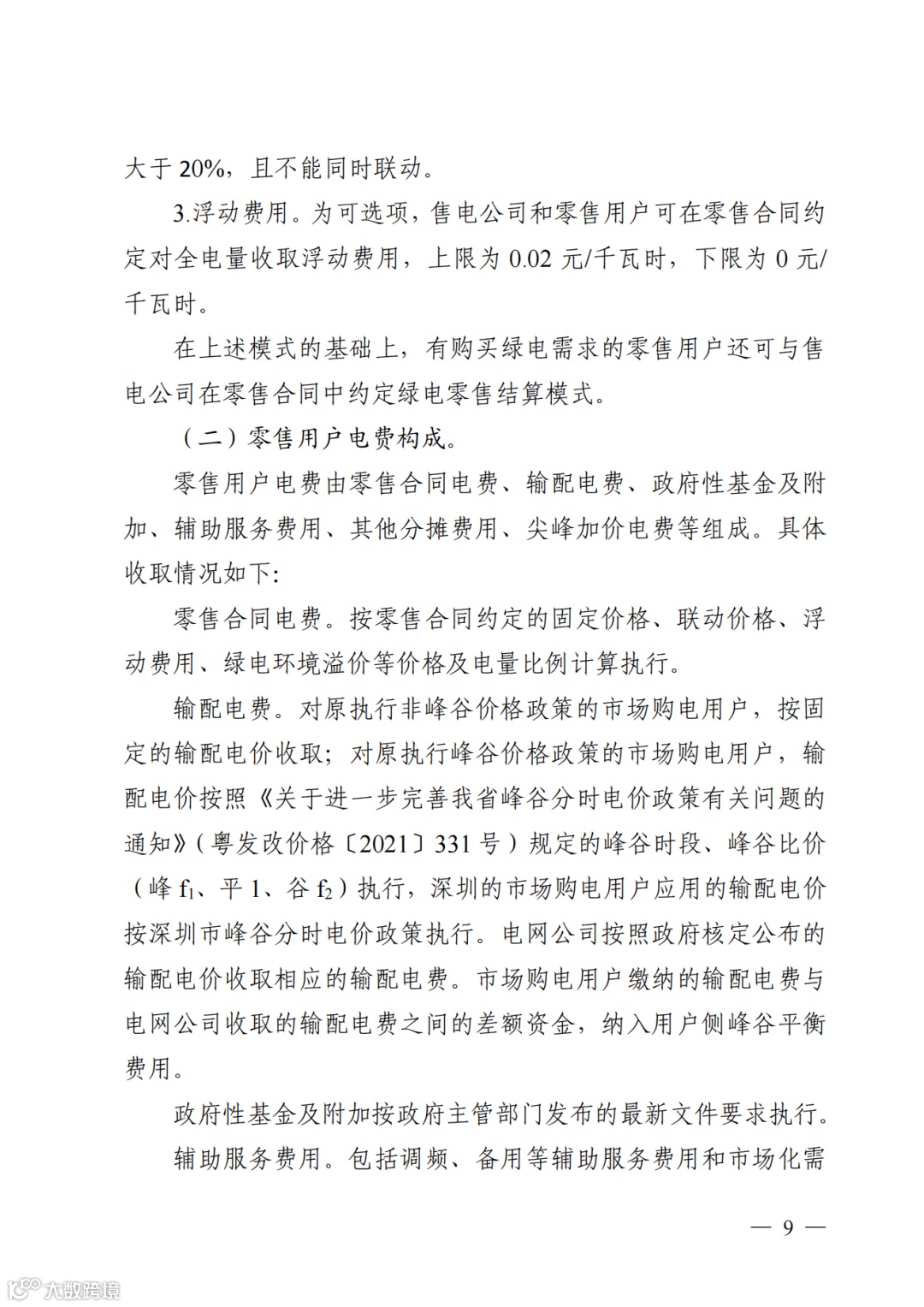 零售用户电费由零售合同电费、输配电费、政府性基金及附加、辅助服务费用、其他分摊费用、尖峰加价电费等组成。