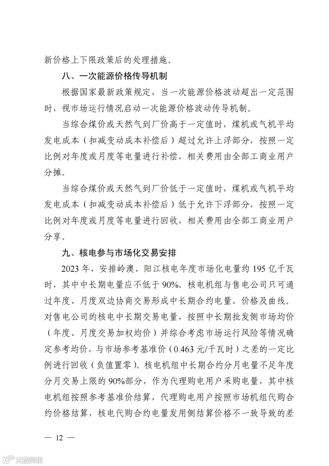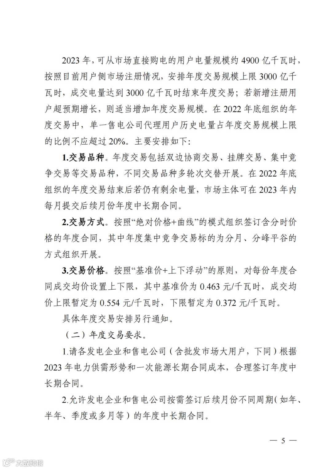 2)交易价格:按照“基准价+上下浮动”的原则,对每份年度合同成交均价设置上下限,其中基准价为0.463 元/千瓦时,成交均价上限暂定为0.554元/千瓦时,下限暂定为0.372元/千瓦时。