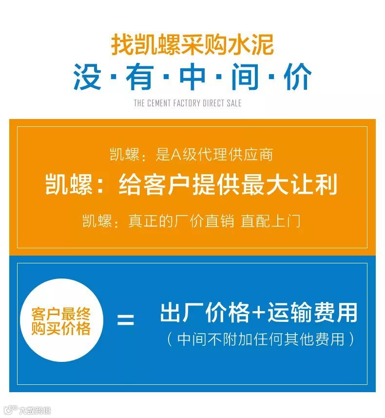 凯螺到家与各大品牌水泥厂家长期合作,是A级代理商,直接对接工厂和客户,不存在中间环节,价格透明,给采购水泥的客户提供最大让利,0差价,贴心提供最优采购方案,降低客户采购成本,站在客户的角度考虑,做到三省原则:省心,省力,省钱