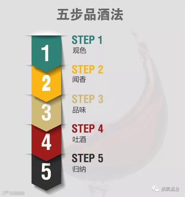一般品鉴葡萄酒也是有一定的流程的,我们看见的专业人士的“赏色闻香轻尝细思”并不是为了看起来更专业。各种品鉴方法万变不离最基础的5个步骤如上图所示,下面我们来为您介绍一下这个流程。