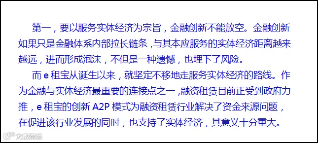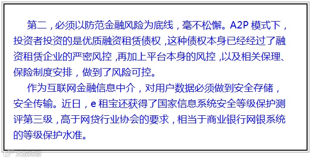 在这方面,国内知名互联网金融平台e租宝有不少经验。这家以融资租赁互联网金融A2P模式立足的新兴平台,针对融资租赁与互联网金融两个行业双重创新。