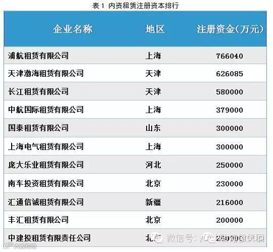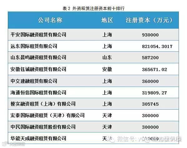 注册资本排名前十的外资租赁公司见表2,在上季度远东国际租赁有限公司以超80亿元人民币独占鳌头,而在平安国际租赁增加注册资本至93亿元人民币后,远东国际租赁排名第二。
