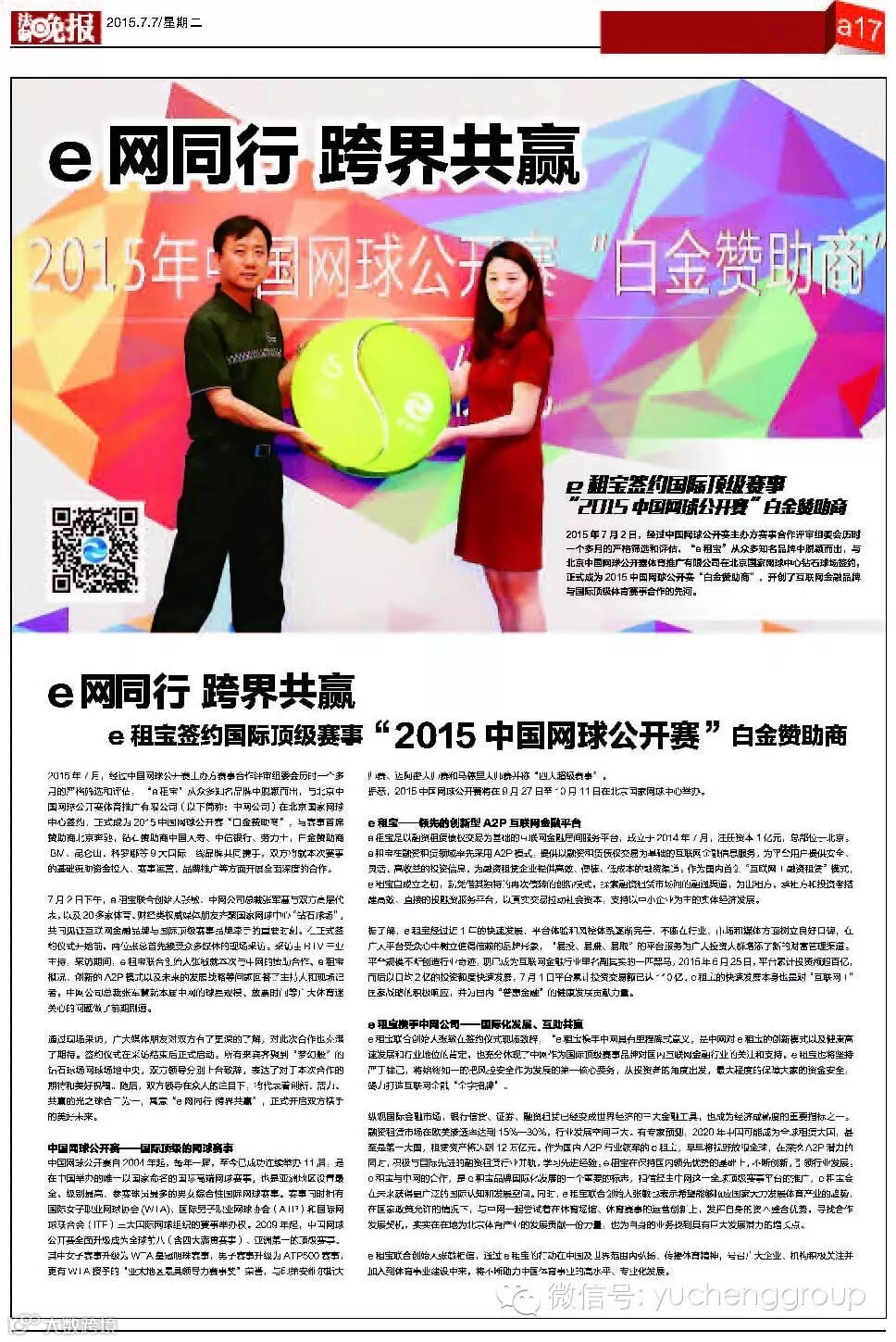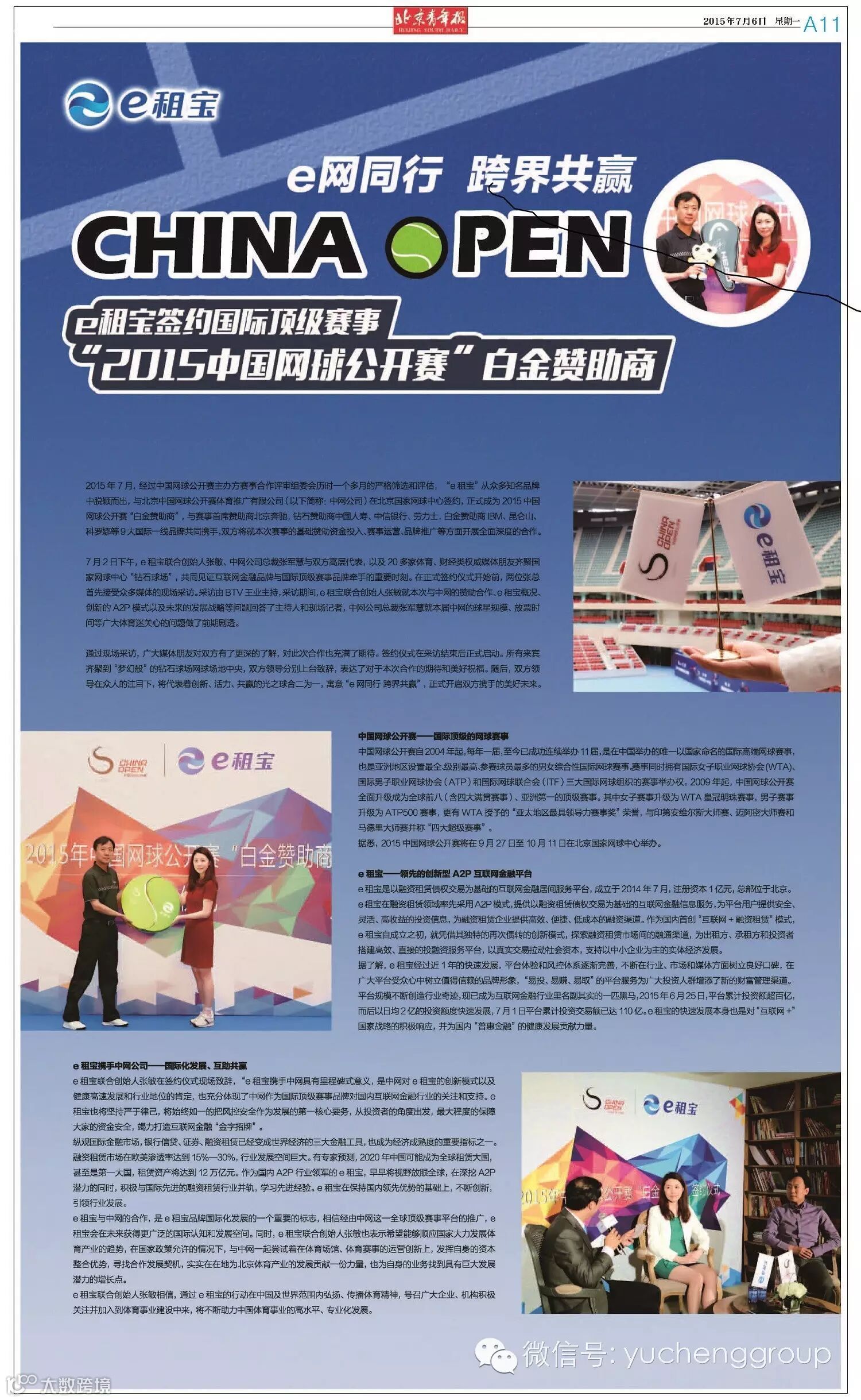 日前,京城两大权威报刊媒体——《北京青年报》《法制晚报》整版刊发e租宝签约2015中国网球公开赛(以下简称:中网)的盛况。凭借两大权威报刊的影响力和此次中网签约事件的重要意义,e租宝再次成为人们街头巷尾的热点话题。