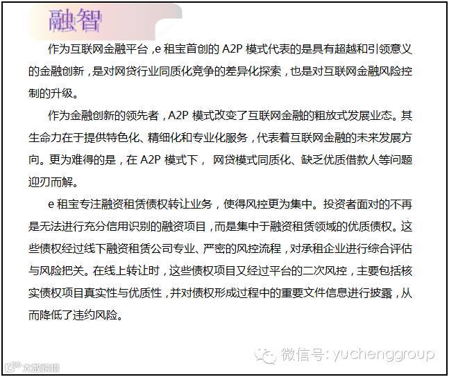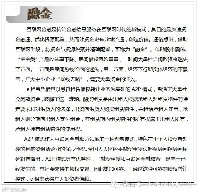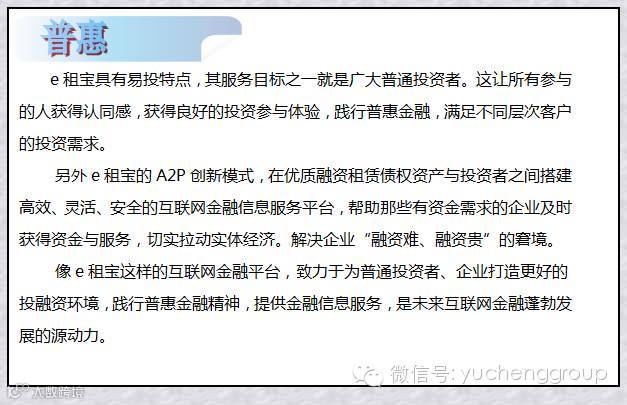 提起金融,很多人想到“银行、证券、风投”等高大上的字眼,但说到“普惠金融”,很多人也许一知半解。普惠金融源于英文“inclusive financial system”,在联合国2005年宣传小额信贷年时首次使用。它是指能有效、全方位为社会所有阶层和群体提供服务的金融体系,实际上就是让所有老百姓享受更多的金融服务,更好地支持实体经济发展。随着互联网时代的来临,如何让普惠金融借助互联网工具发扬光大,已成为需要全社会求证的公共命题。e租宝,作为知名的融资租赁互联网金融平台,凭借其独有的三大“融合“优势,正在谨慎严密而又富有创造力地完成这道“试题”。