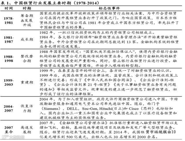 尽管国内租赁行业的发展最早可以追溯至20世纪80年代,但行业真正起步却晚至2005年,快速发展的第一阶段主要是2008-2010年间,中国由于监管和法律的放开(金融租赁准入),一枝独秀逆势高速增长,在2009年跻身全球前四大租赁业务国家行列。