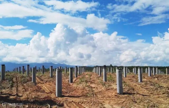 广阔的土地上竖起一排排混凝土管桩支架,支架上面会装置光伏发电的光伏板。