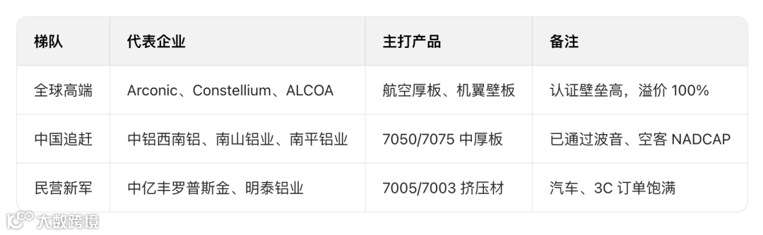 - 成分:Zn-Mg-Cu系,主力牌号7075、7050、7475、7005、7049;