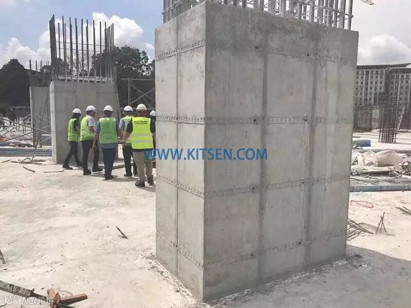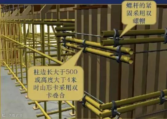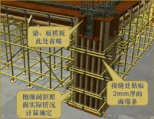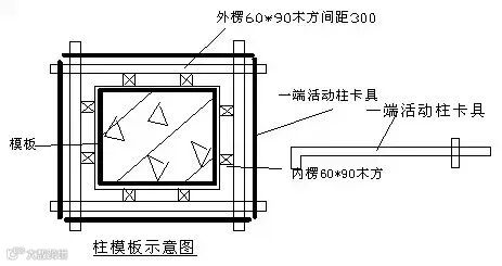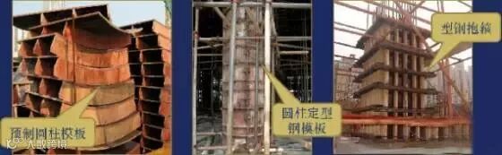 圆柱采用定型模板支设;对于截面较大的矩形截面混凝土柱,其抱箍可采用型钢,型钢型号和间距通过计算后确定。