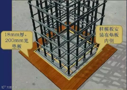 6、设置模板定位基准:在墙、柱主筋上距楼面约100mm处、距上部梁板、底约500mm处,根据模板线,按保护层厚度焊接水平支杆,以防模板的水平移位。