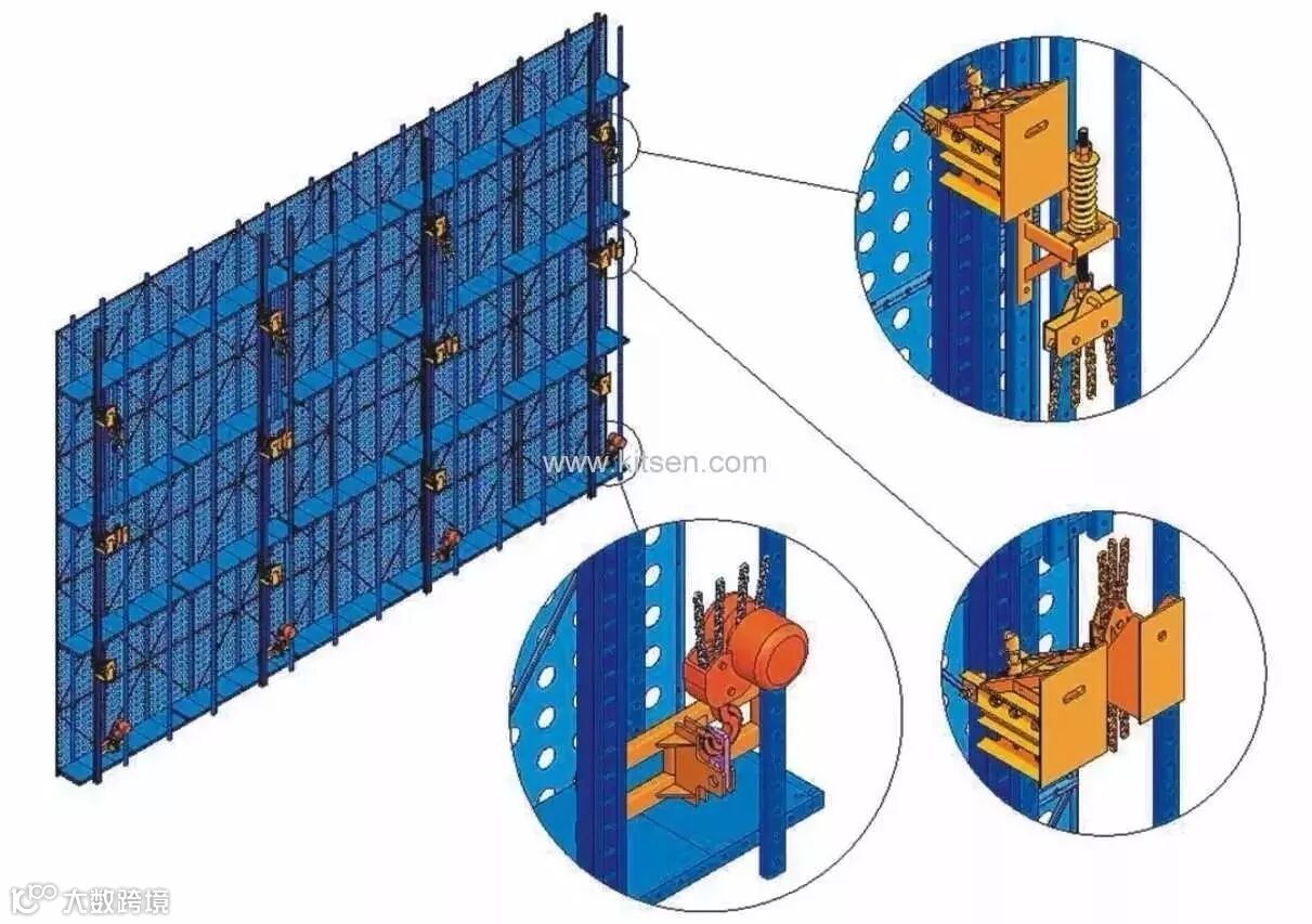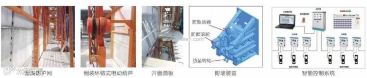(7)附墙装置集防坠落、防倾斜、导向于一体,每个机位装有3个附墙装置,防坠落、防倾斜性能好。