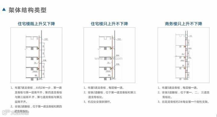 (1) 第一、二层需使用脚手架, 第三层才能使用爬架。