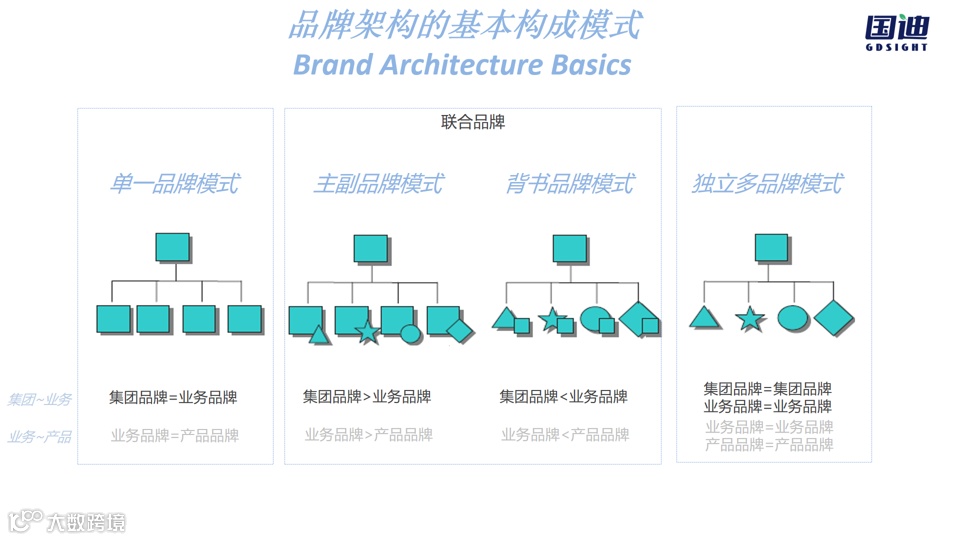 ·背书品牌模式(子品牌>母品牌):子品牌在市场上直面用户,母品牌在背后提供信任担保,这种架构特别适合需要不同业务/不同产品灵活定位灵活竞争的情形,适用于不相关多元化的集团出海,以及相当一部分消费品集团化企业。