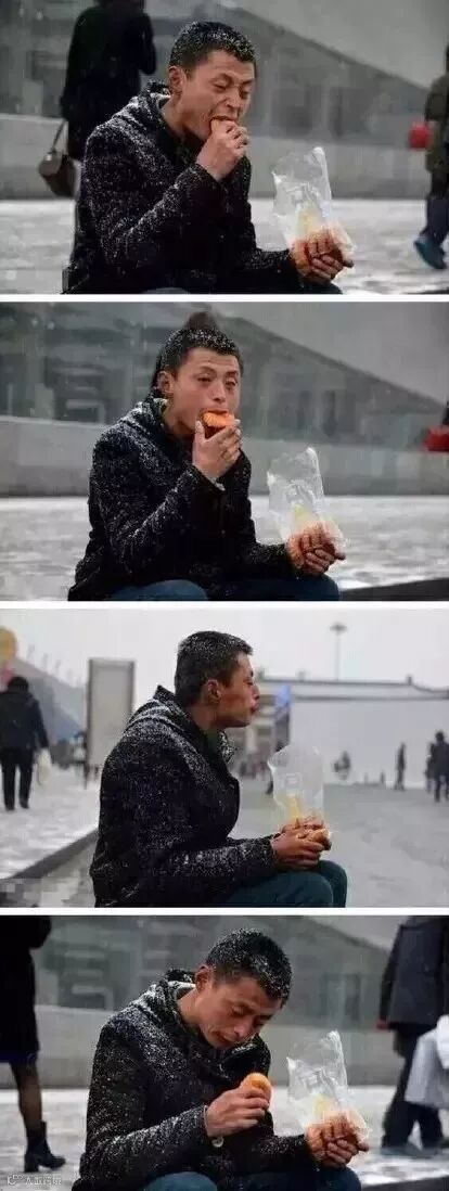 大雪纷飞,一个男人坐在地上,狼吞虎咽的吃一袋蛋糕,这是谁的儿子,又是谁的父亲,如果不是生活艰难,这么冷的天,不会不舍得吃一口热乎饭。