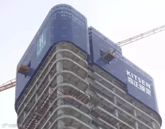 3、架体为整体,工作平台宽,可沿建筑造型凹凸设计架体,满足施工时整架体与混凝土外墙间工作区距离。架体外采用铝合金高密度保护网,防止工具、人员等下坠。