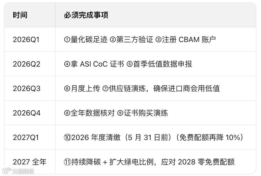- 数据:每月上传CBAM Registry,保持连续