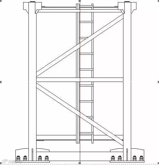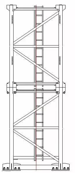 将塔身两个标准节拼装后吊装与底节相连,用高强度螺栓紧固好。每根高强度螺栓均应装配两个螺母,应拧紧防松。标准节上有踏步的一面应位于准备安装平衡臂的下方。