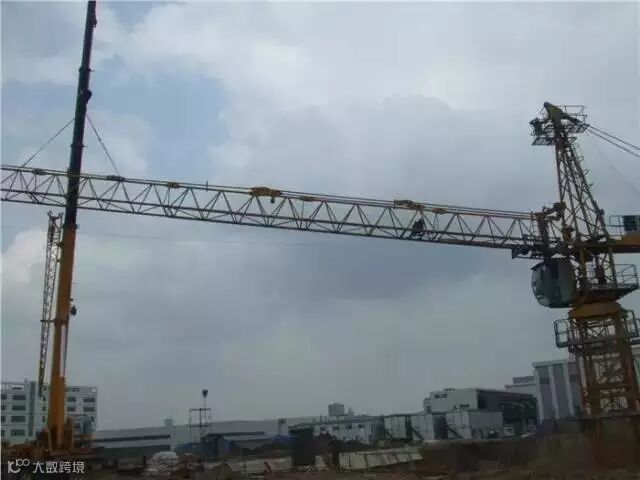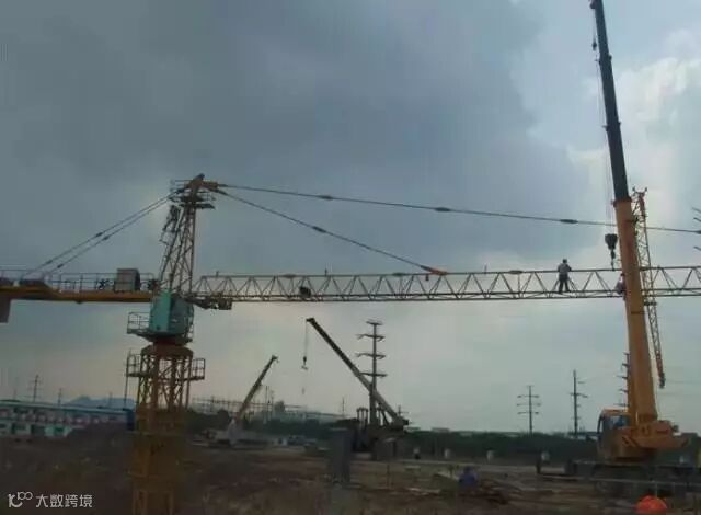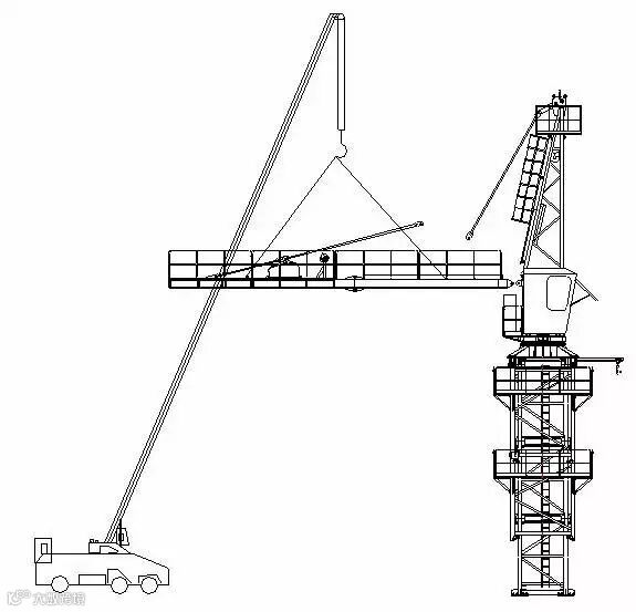 在平地上拼装好平衡臂及左右各两节拉杆,并将卷扬机、电阻箱、电控箱等安装在平衡臂上,接好各部分所需的电线,然后,将平衡臂吊起来,安装回转塔身的对应接头上,并固定完毕。再抬起平衡臂成一角度以便于平衡臂拉杆的安装,安装好平衡臂拉杆后,再将吊车卸载。
