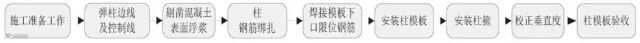 工艺说明:按图纸尺寸制作柱侧模板后,测放好柱的位置线,钉好压脚板后再安装柱模板,两垂直向加斜拉顶撑。柱模安装完成后,应全面复核模板的垂直度、对角线斜拉长度差及截面尺寸等项目。柱模板支撑必须牢固,预埋件、预留孔洞严禁漏设且必须准确、稳劳。