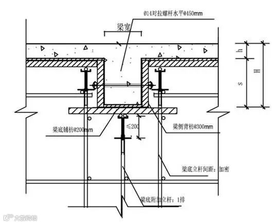 工艺说明:当梁高超过600mm时,梁侧模须必须采用对拉螺杆加固,梁下必须设单独立杆并与支模架有机连接,且连接点数不少于两处。