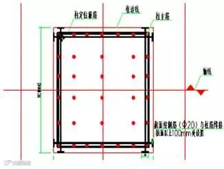支模前先在墙柱轮廓线外200mm位置弹出墙柱控制线,用来复核墙柱支模。按放出的柱边线焊接Ø20内截面控制筋,每个方向两根。(直径同箍筋,设置于柱模上中下三道)或者在放出的柱边线的柱四个角钻孔打入限位筋。