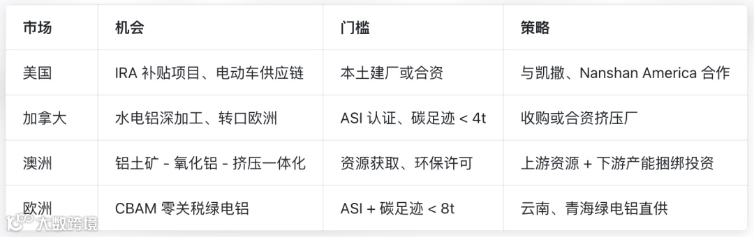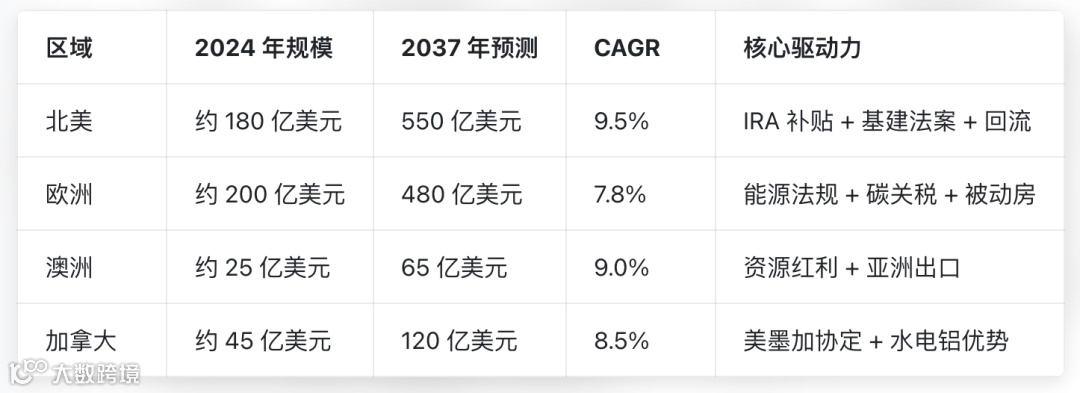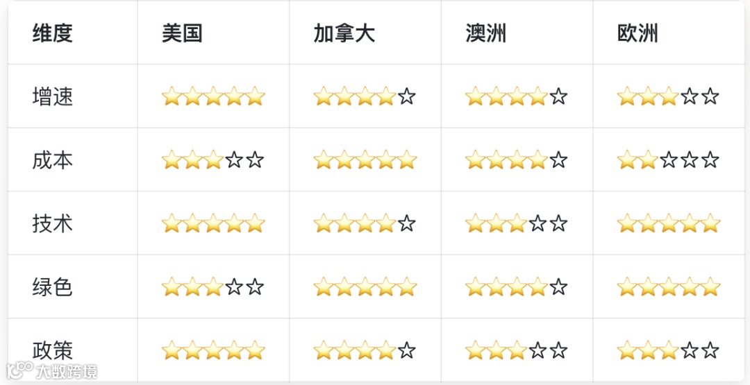 美国靠政策红利领跑增速,加拿大凭水电成本"闷声发财",澳洲吃资源红利但深加工不足,欧洲技术领先但能源成本拖累。