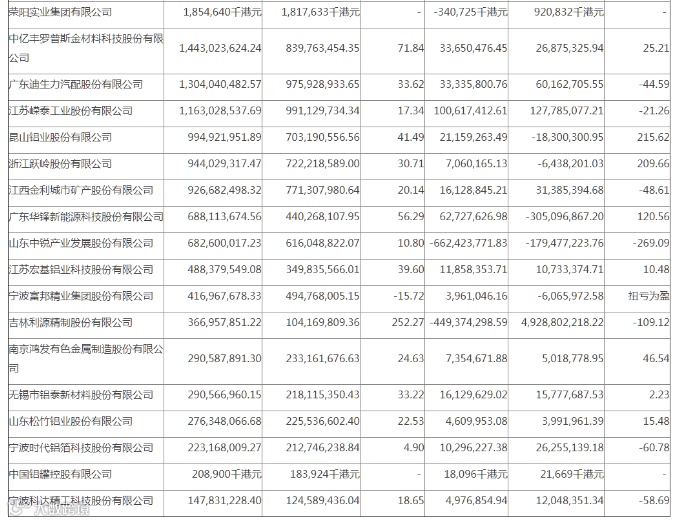 其中,营业收入以利源精制、顺博合金、鑫珀股份、涨幅最大,分别为252.27%、105.07%、101.72%;鼎胜新材以2968.07%的涨幅创下受统计上市铝企业中净利润增长之最,其次是神火股份(涨幅802.57%,下同)、中国铝业(564.6%)以及常铝股份(369.21%)。