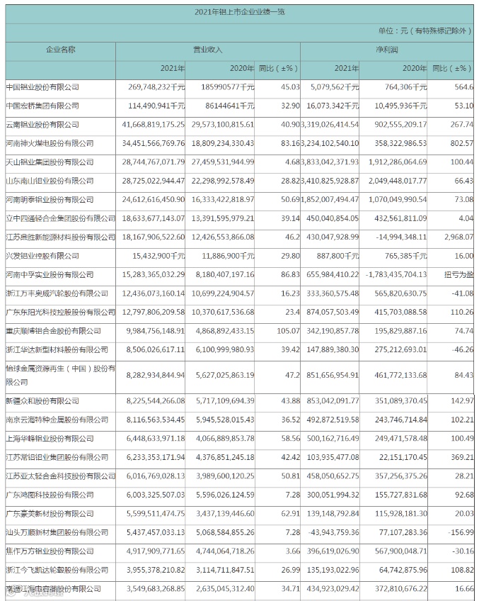 背景调近日,57家铝产业链上市企业发布2021年报。数据显示,2021年营业收入实现正增长的有56家,净利润实现正增长的共有43家。