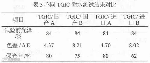表3为固化剂采用不同厂家TGIC的涂层耐水实验结果。