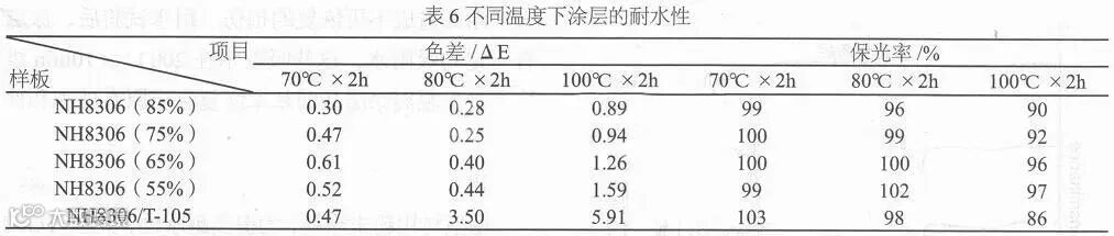 为此将3.4中不同树脂份和3.1中NH8306/T-105固化等5个涂层,在不同温度条件下进行耐水测试。