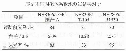 同样的树脂NH8306,固化剂不同耐水性差异也较大,TGIC固化优于T-105固化。从成本和耐水性能综合考虑,优选聚酯/TGIC固化体系。