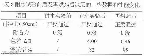 表8是涂层样板在耐水测试前后以及再烘烤后的光泽、色差、冲击和附着力。结果显示耐水试验后涂层的冲击和附着力没有明显变化,而耐水试验导致的光泽和颜色变化,经过再烘烤基本恢复到耐水试验前。