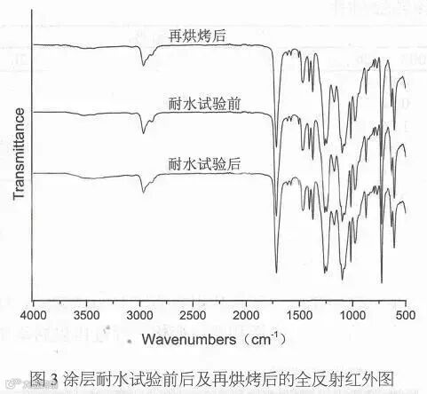 耐水试验后3500cm-1附近的羟基吸收峰明显变宽,应当是残留在涂层中水的吸收峰,再烘烤后基本恢复成试验前。