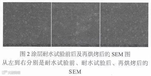 图2SEM形貌扫描图显示耐水试验后,涂膜仍保持平整,没有出现涂层降解形成的颗粒,只在局部有少量近似圆形的斑点。再烘烤后,斑点消失,涂层形貌恢复成耐水试验前,未发现涂层有外观损伤。